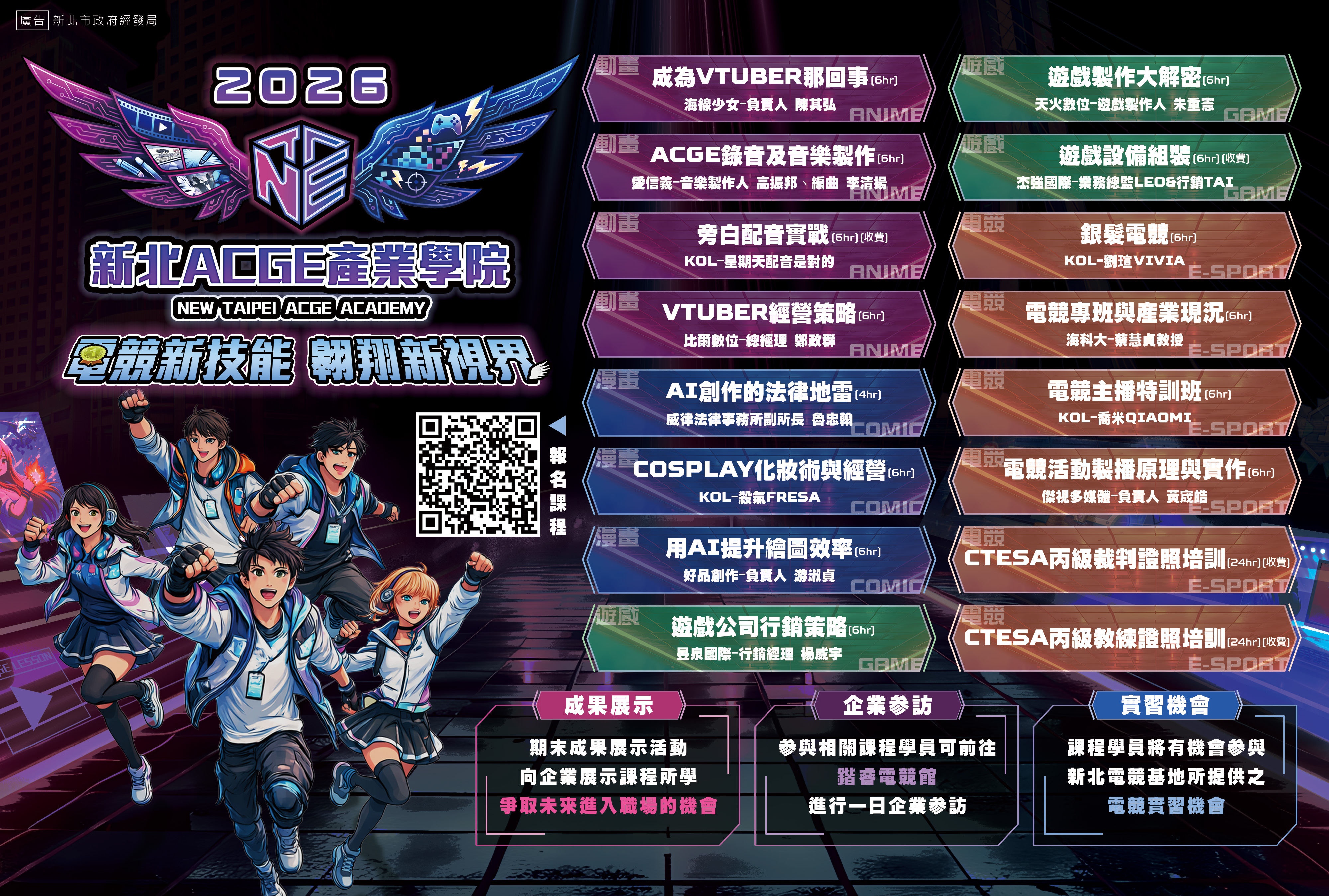 - 為推動電競產業發展,該局自107年起成立「新北電競基地」(新北市三重區重新路一段87號3樓),並持續辦理電競產業人才培育課程。今(115)年將於3月開辦「新北ACGE產業學院」,涵蓋A(Animation,動畫)、C(Comic,漫畫)、G(Game,遊戲)及E(ESports,電競)四大類別,共16個主題課程,分別開設「基礎班」及「進階班」,以實務導向課程設計與專業分流培訓為核心,邀集產業講師、內容創作者及專業職人共同授課,透過專業課程安排與實作學習模式,協助學員深化專業技能、強化職涯發展即戰力。